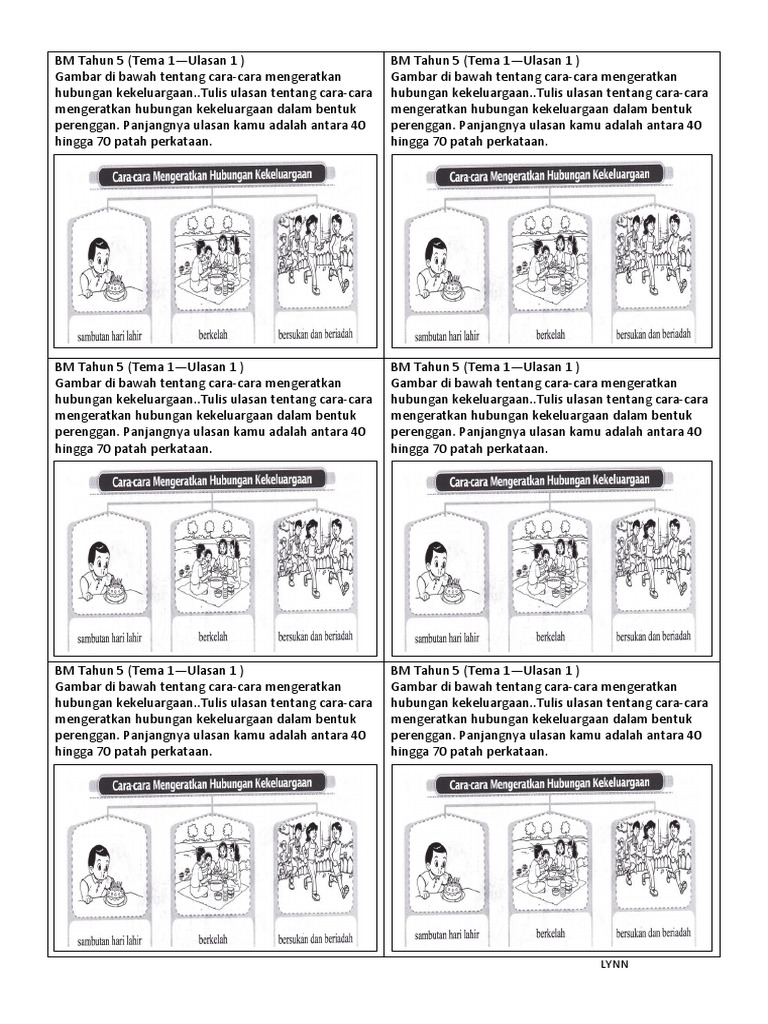 Hubungan kekeluargaan semakin renggang kesan factor dan usaha cara mengeratkan hubungan kekeluargaan. Aktiviti kekeluargaan vital kerana dapat mewujudkan suasana yang bahagia sesama ahli keluarga dan juga mengeratkan ikatan silaturahim bak isi. Ulasan tahun 5 tema 1.